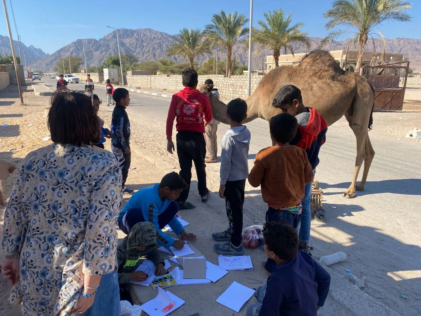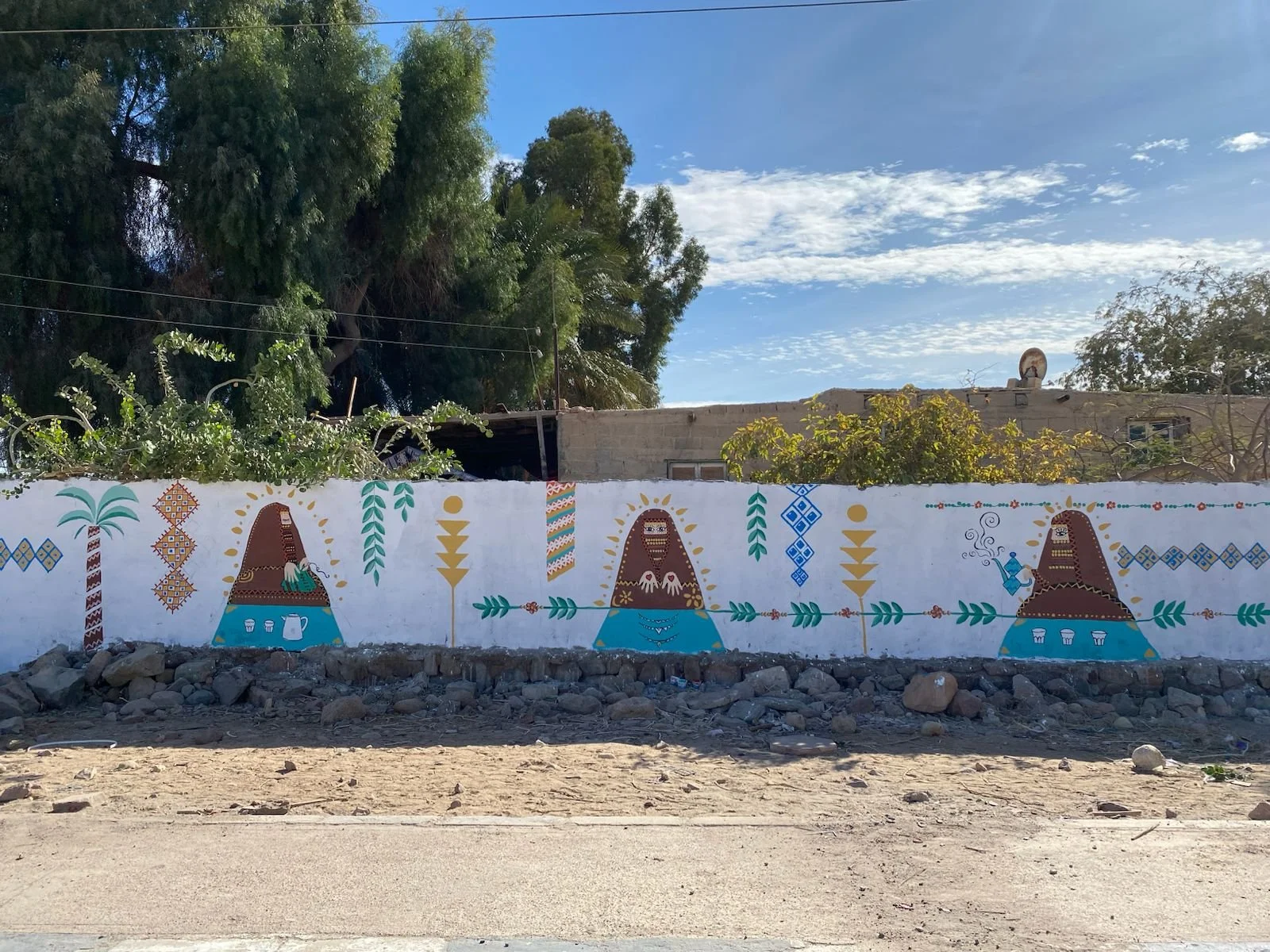This mural was created in collaboration with the Habiba Learning Center and the project Waseet murals, with the goal of bringing beauty and color to a local street in Nuweiba. Because the neighborhood is predominantly Bedouin, we worked closely with women of the Muzeina tribe to select motifs that reflect their lives and creativity.