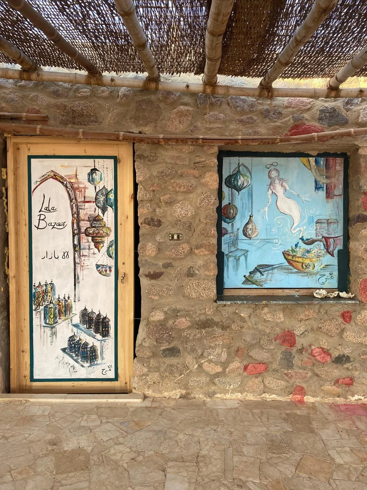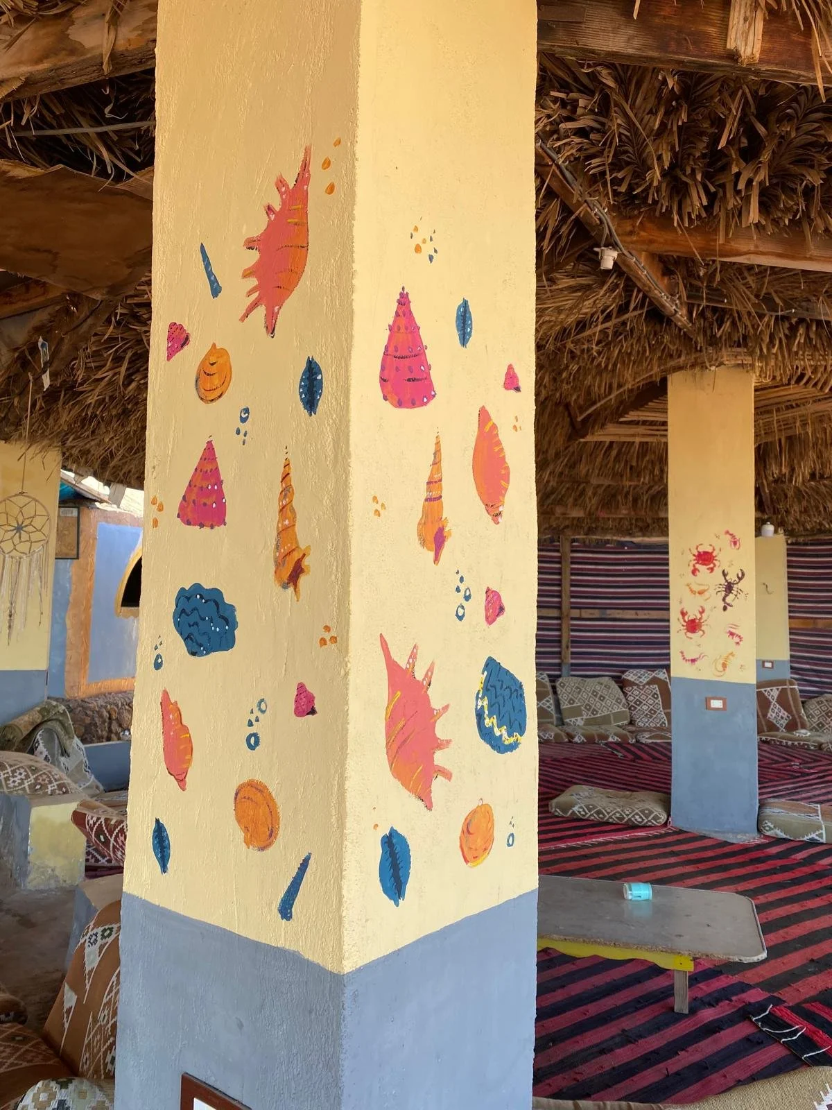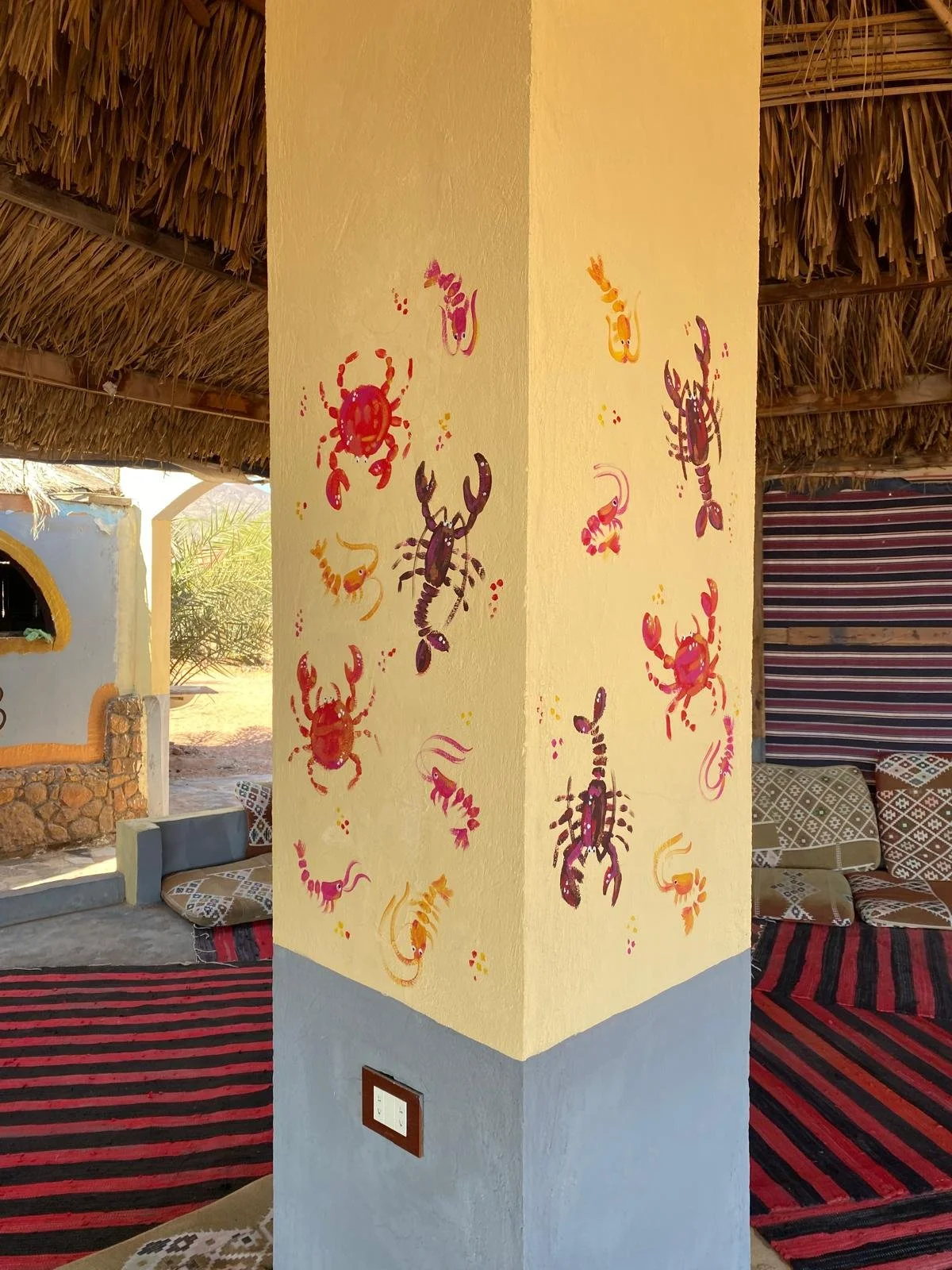 During my artist residency at Lala Land, Egypt, I had the joy of transforming the camp’s huts and public dining areas with murals. I painted the pillars of twelve huts — each with its own theme — and completed four large-scale murals that bring the spaces to life.