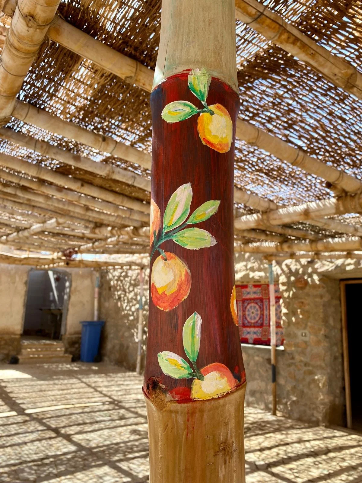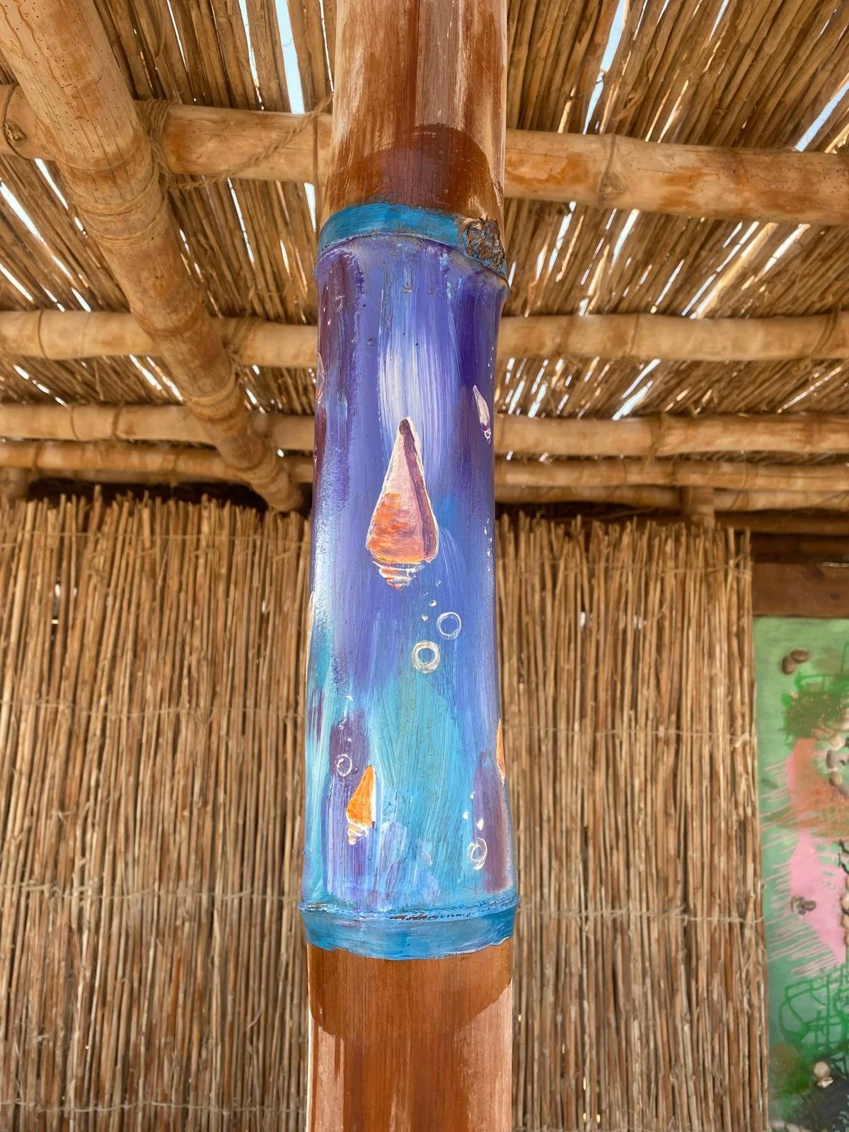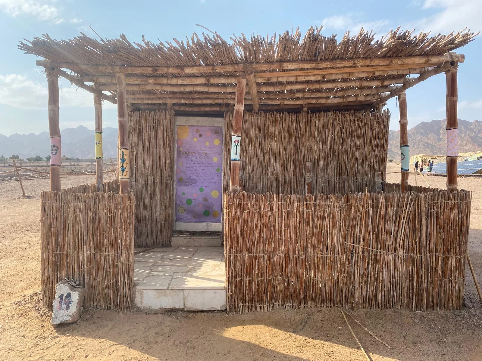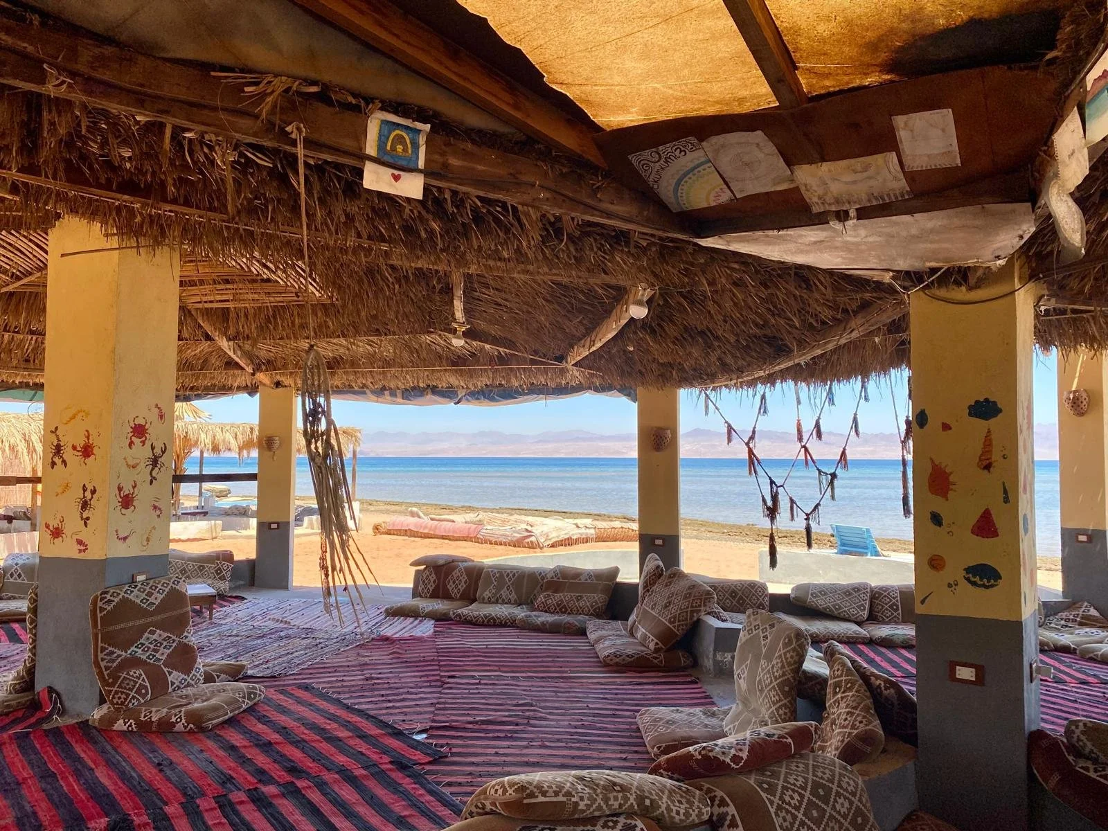 During my artist residency at Lala Land, Egypt, I had the joy of transforming the camp’s huts and public dining areas with murals. I painted the pillars of twelve huts — each with its own theme — and completed four large-scale murals that bring the spaces to life.